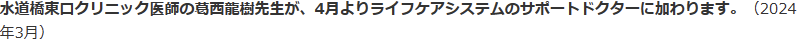 - 水道橋東口クリニック(連携協力医療機関)の診療科(標榜科)が「内科・老年内科・老年精神科・老年緩和ケア内科」になりました。(2024年1月)